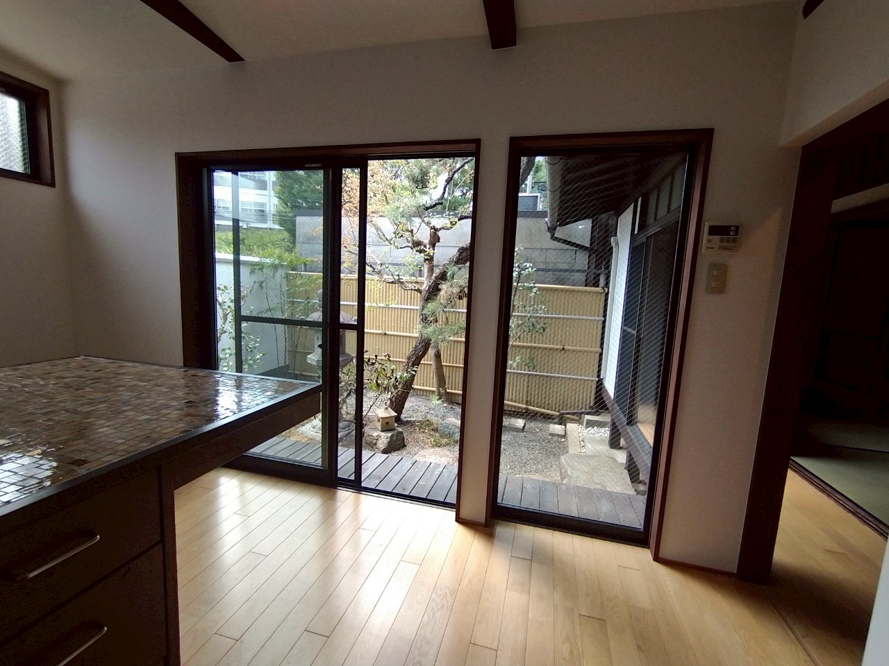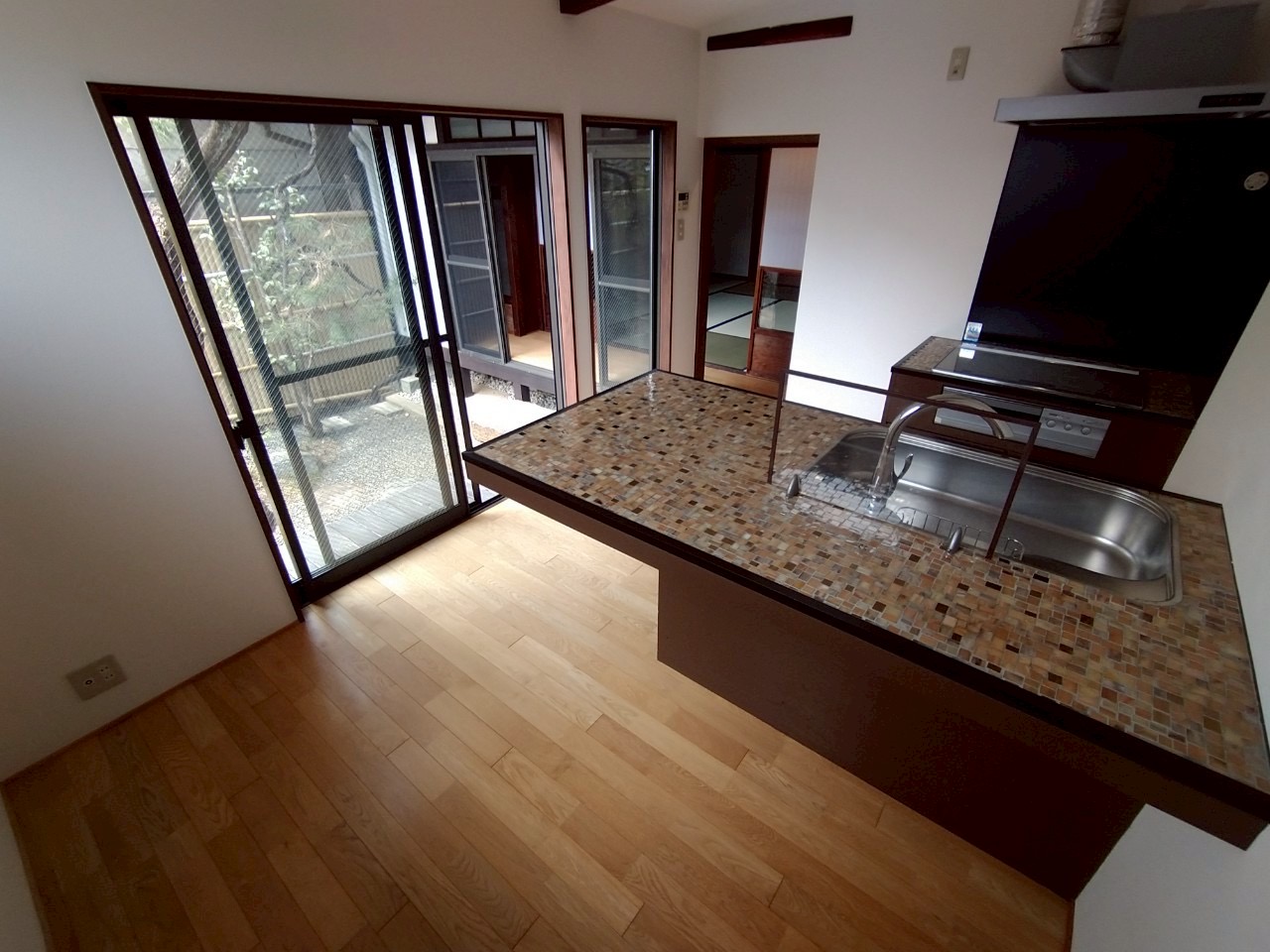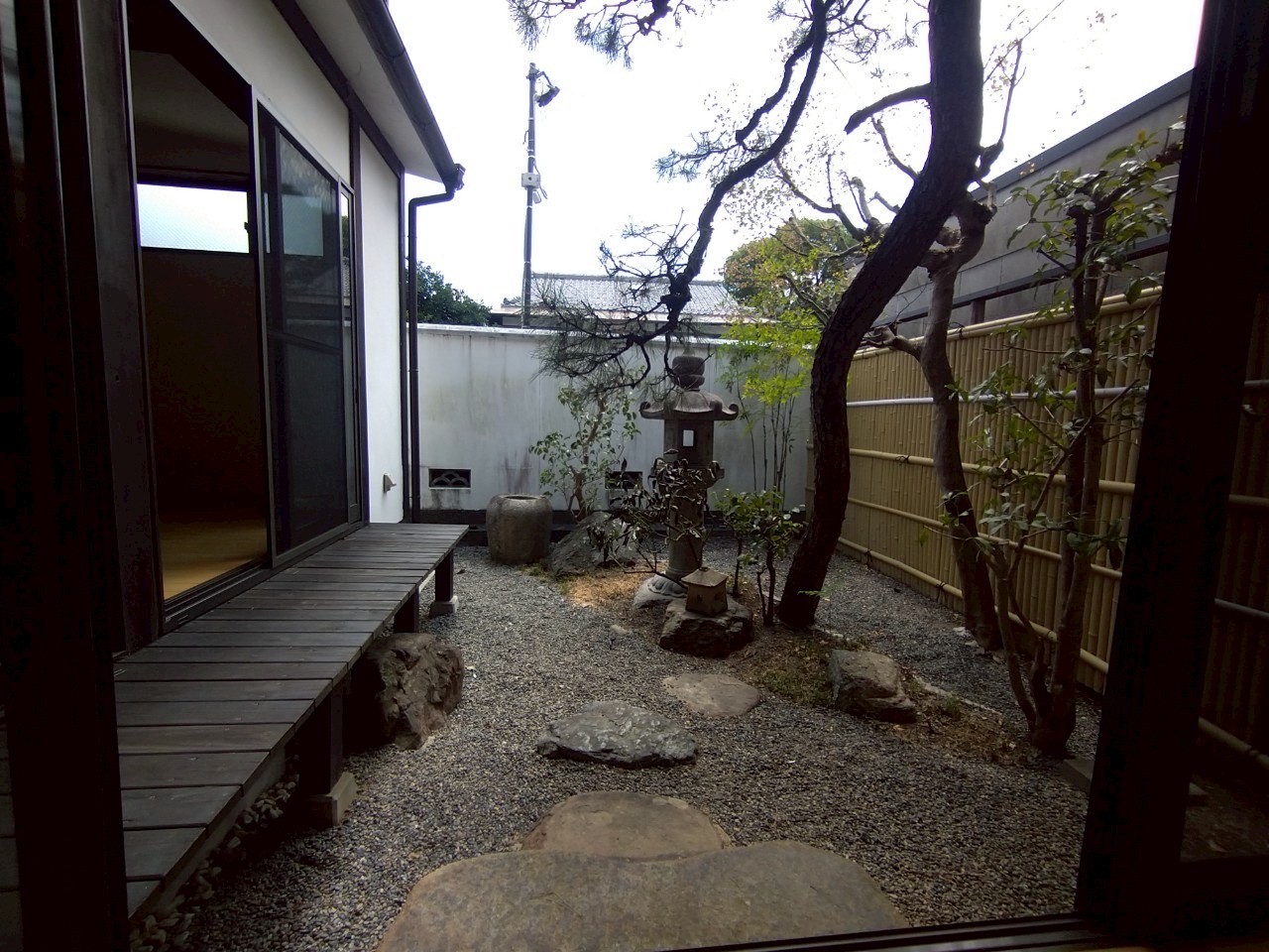 松を配した和風庭園や茶室跡の趣ある客間、そしてオリジナルのかわいいキッチンが